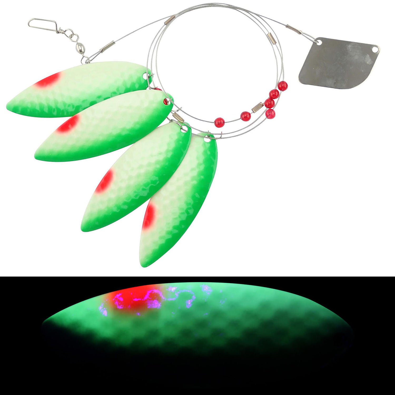 The Moonshine Moon Bell is brightly colored with Moonshine's proprietary paint for even more fish attraction! The color patterns make these ideal for low light fishing but their vibrant flash makes them great for fishing all day too. The Moon Bell rig comes with four brightly-colored blades on a flexible cable with a trolling rudder and added attractor beads!