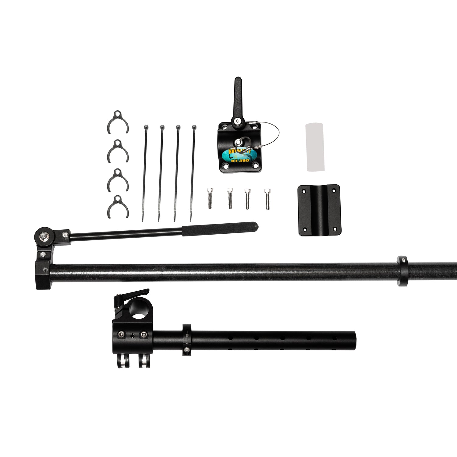 This assembly has a base that mounts to either a 7/8 or 1 inch rail. The 1.125" carbon fiber vertical pole is 72" and Aluminum Cross Shaft is 14". The components are anodized aluminum with stainless steel ratcheting handles and stainless steel hardware. The 18" handle can pivot 180 degrees for easy storage and can be used at any angle. The handle has a comfortable foam grip. The transducer is clamped on the end of the pole with the bracket that comes with the transducer.