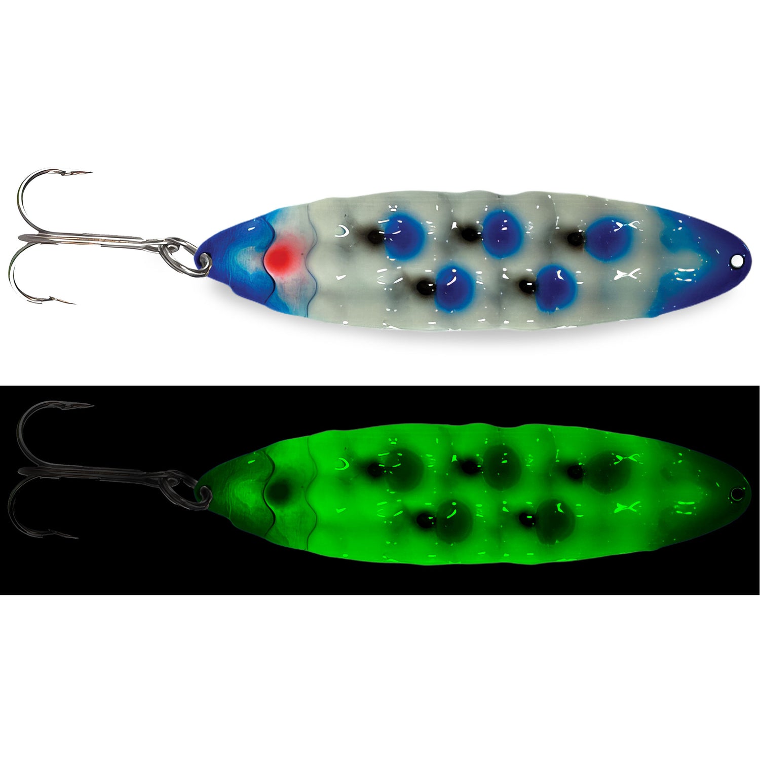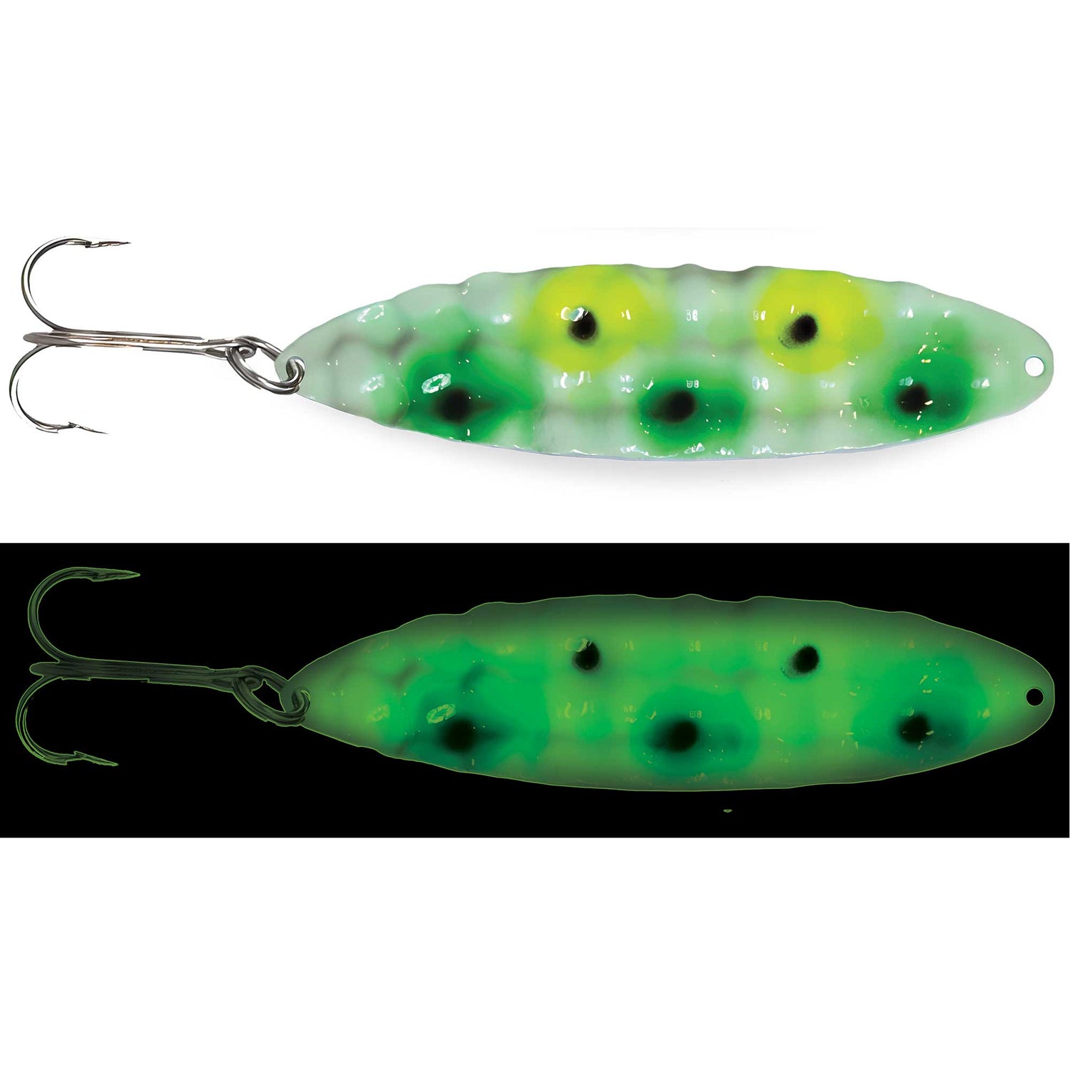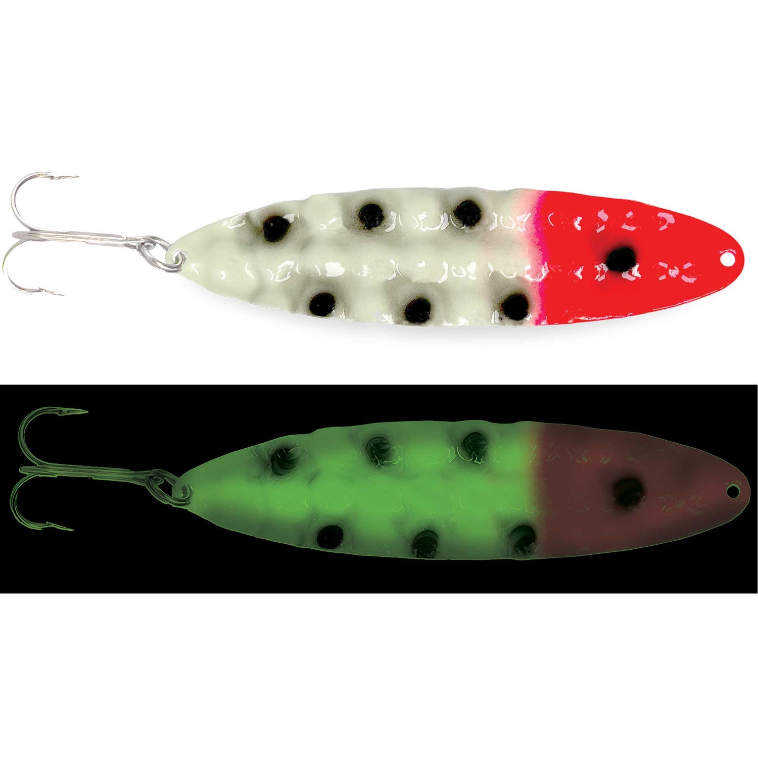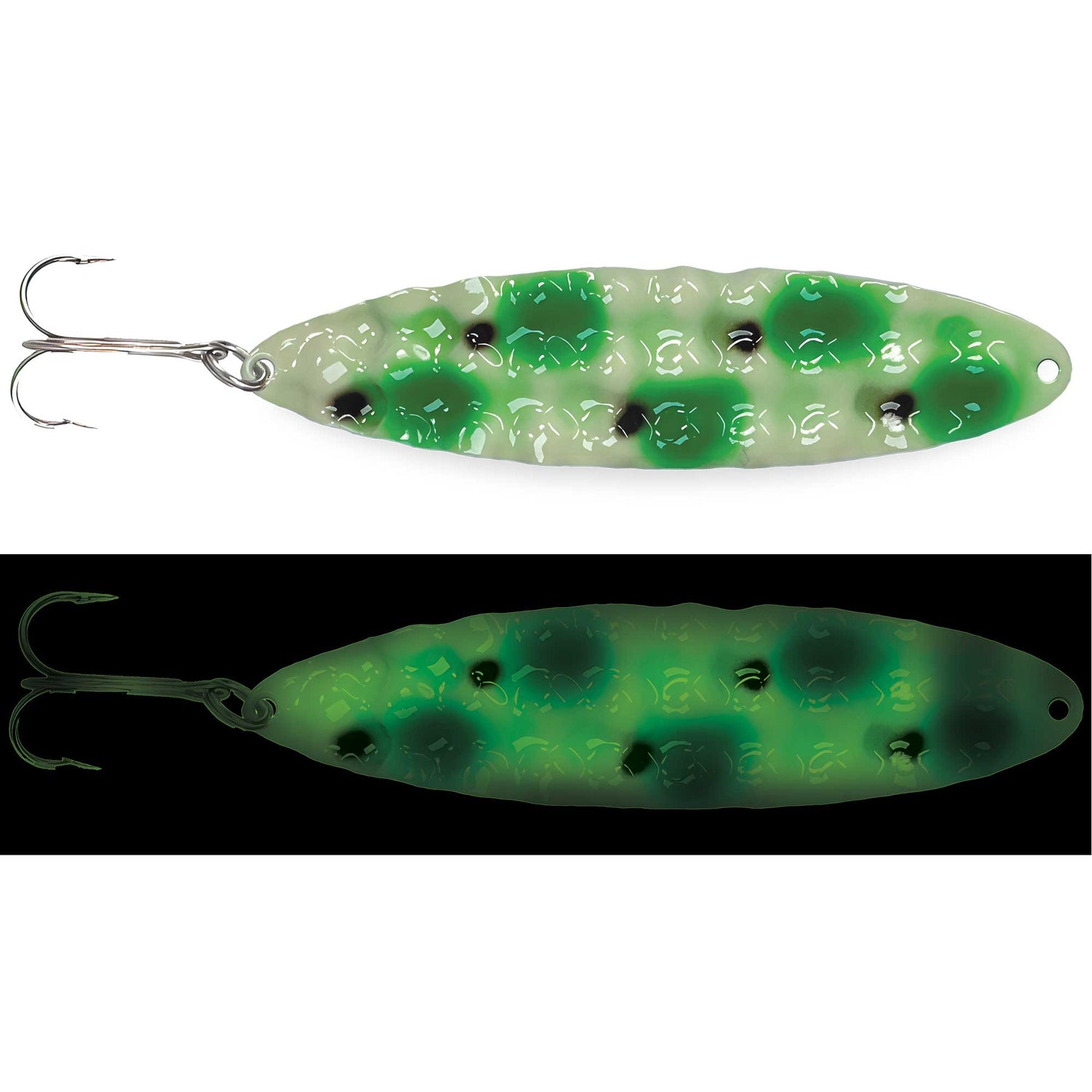 Presenting a one-of-a-kind deep hammered pattern, the New Moonchips Spoon from Moonshine Lures lends ultimate erratic spoon action. The shape maximizes erratic underwater action with an aggressive flutter and flip while the deep hammered contour creates a super solid spoon that mimics a wounded or distressed baitfish. Finished with the longest and strongest painted Glow in Fishing, natural or UV light charges the spoon for hours on end, perfect for standing out.