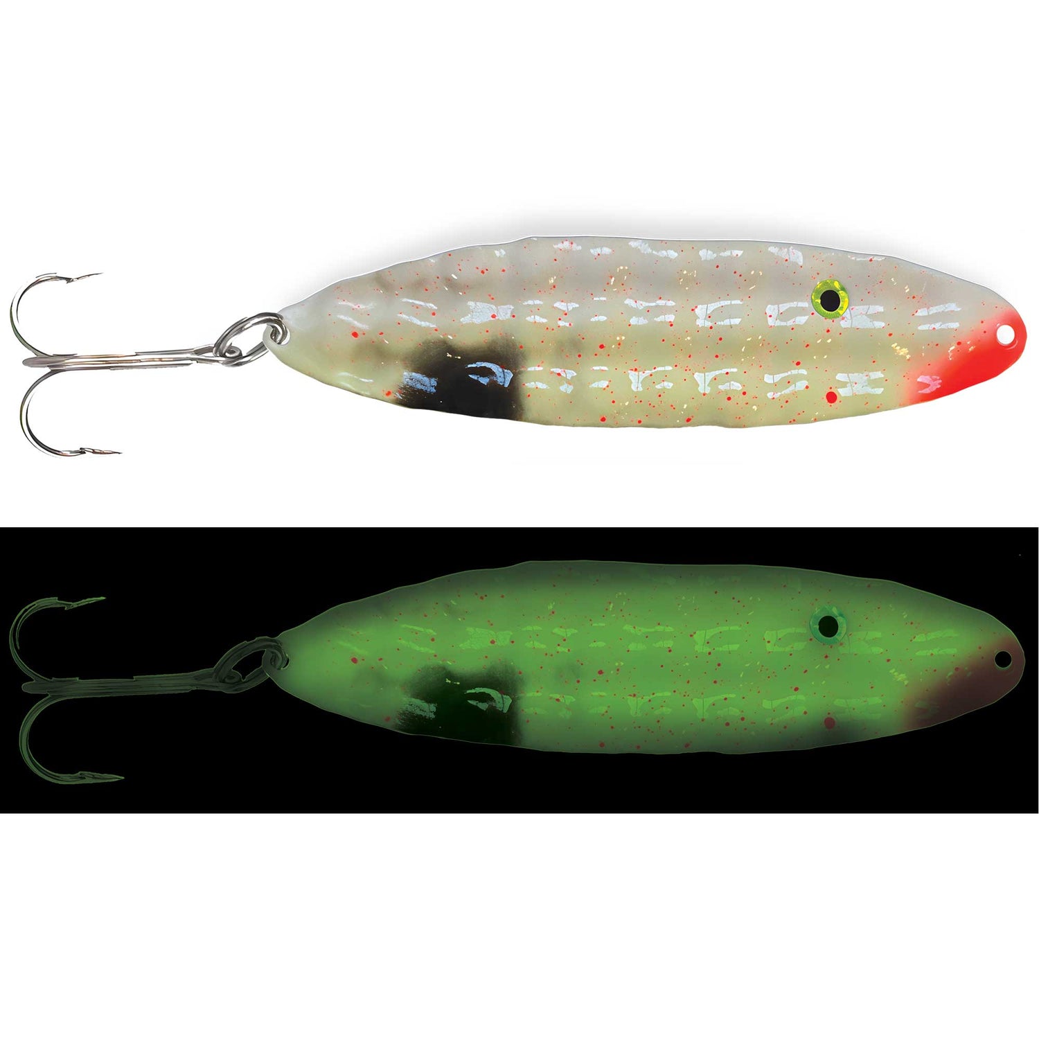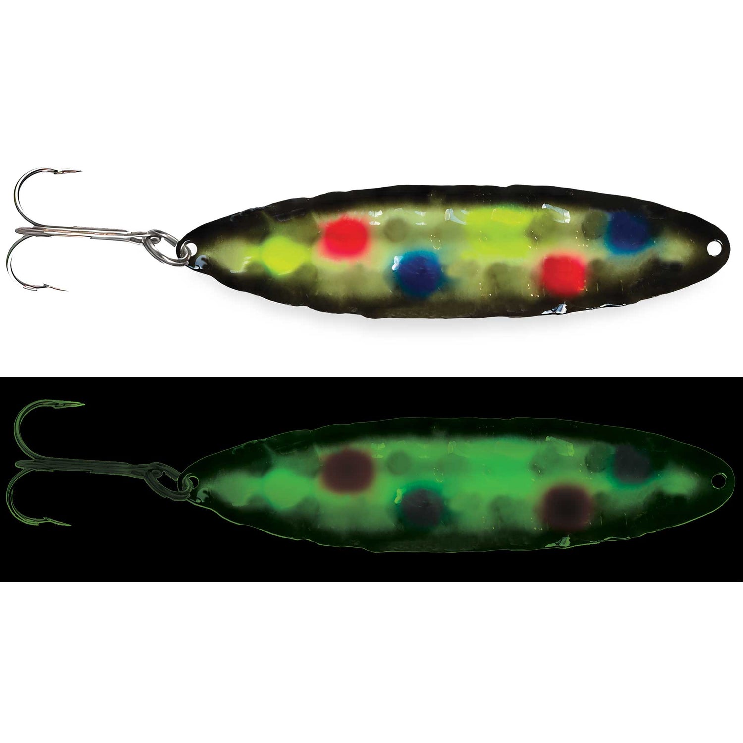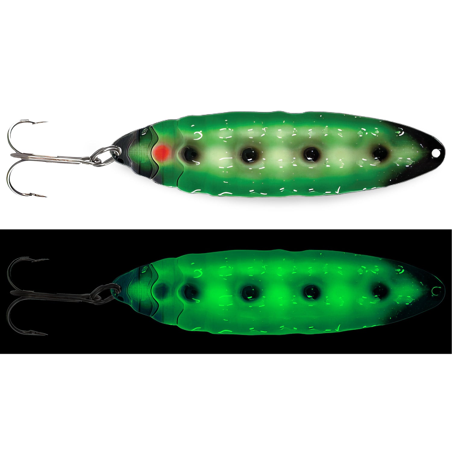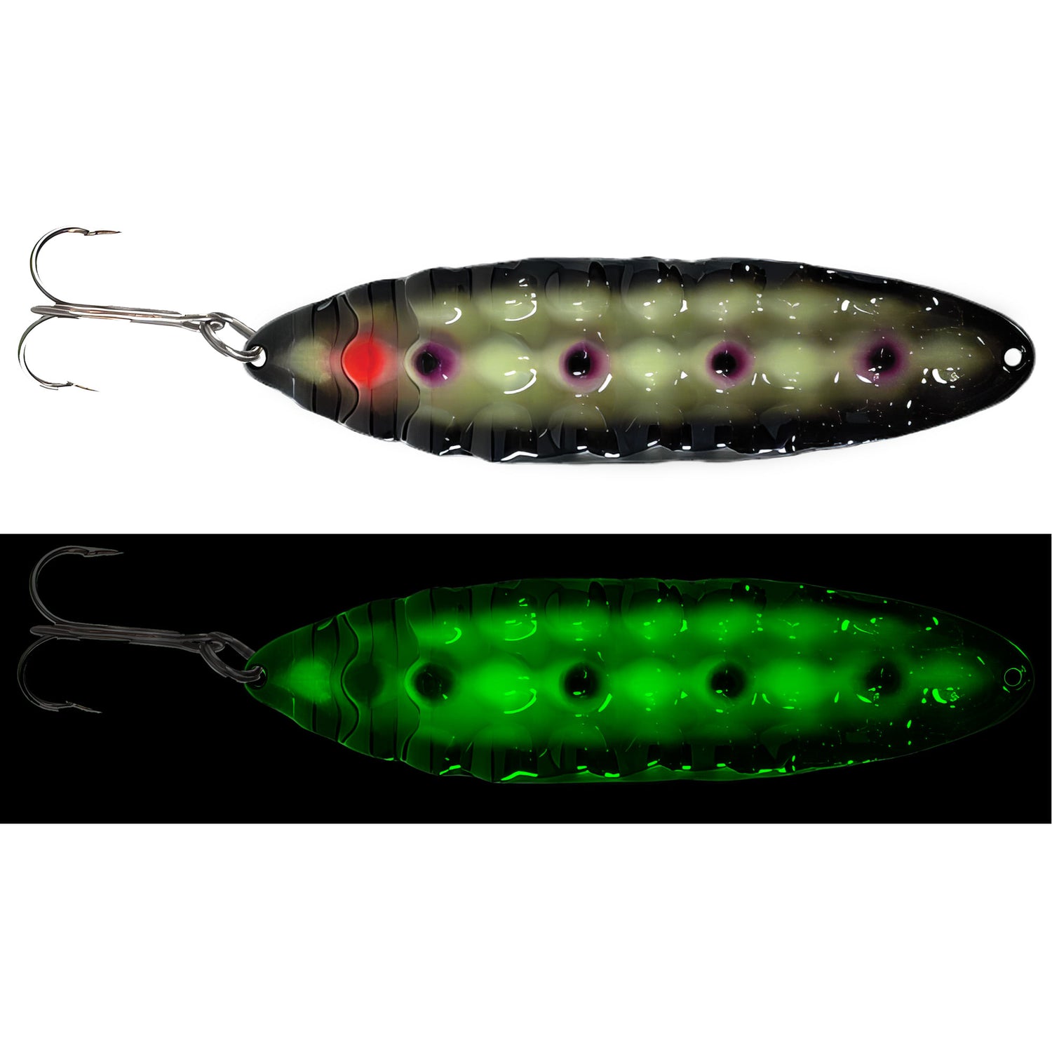Presenting a one-of-a-kind deep hammered pattern, the New Moonchips Spoon from Moonshine Lures lends ultimate erratic spoon action. The shape maximizes erratic underwater action with an aggressive flutter and flip while the deep hammered contour creates a super solid spoon that mimics a wounded or distressed baitfish. Finished with the longest and strongest painted Glow in Fishing, natural or UV light charges the spoon for hours on end, perfect for standing out.