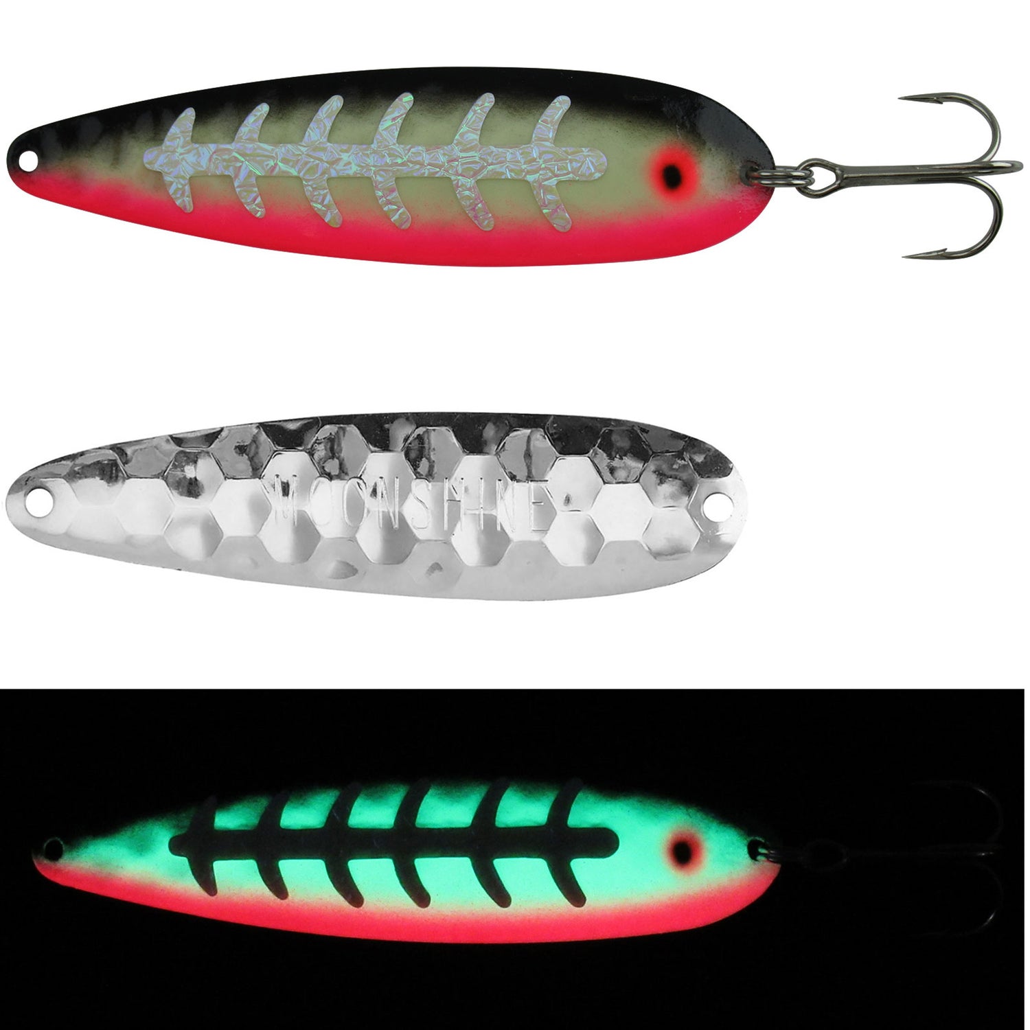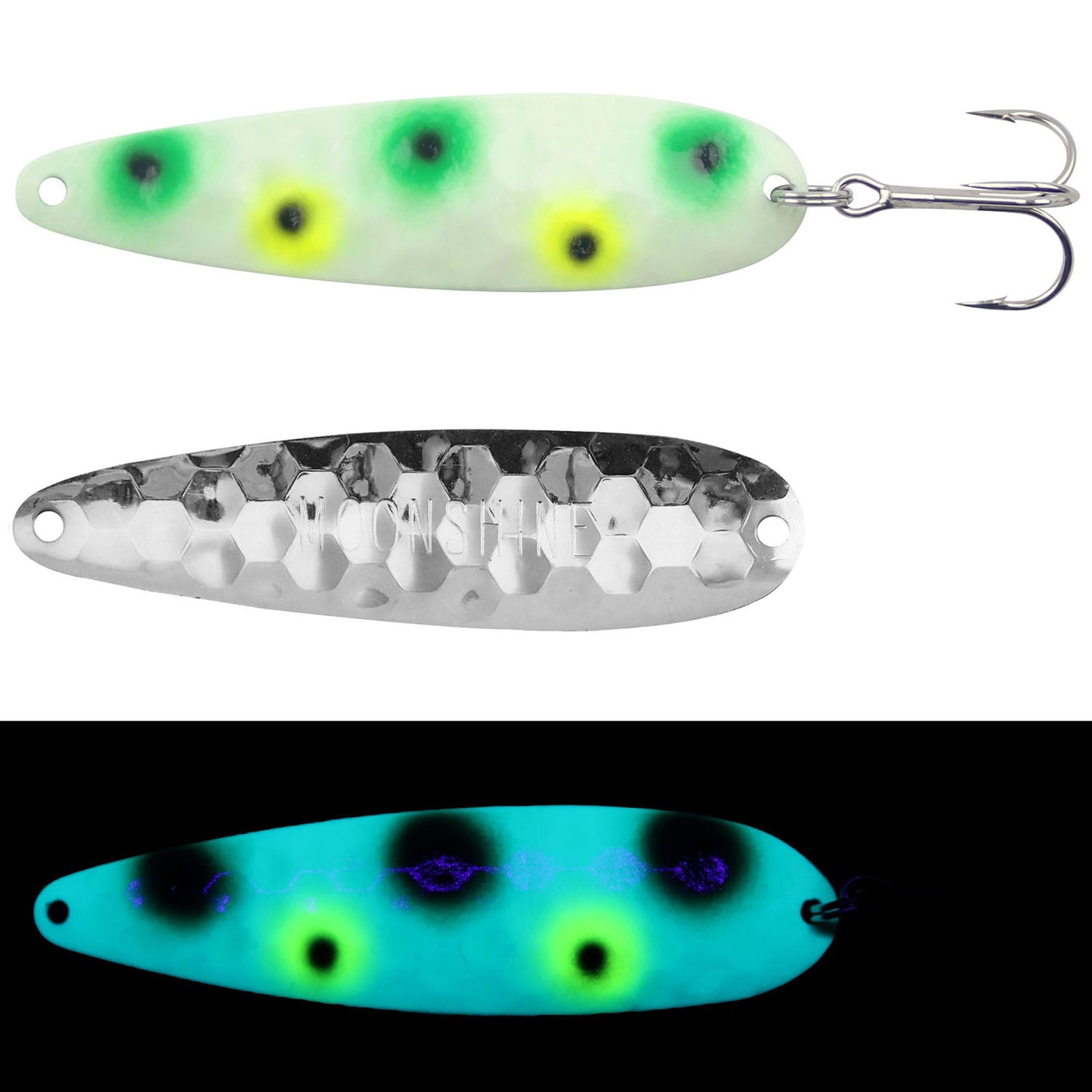 - The Moonshine Lures Trolling Spoons are some of the brightest glowing lures that you'll find on the market today! After being exposed to natural or UV light, these spoons will be glowing for hours on end. That impressive glow is perfect for drawing in the attention of predators. Moonshine Standard Trolling Spoons are also ideal for being fished during the day as they are highly UV-reflective. Ideal for catching salmon, trout, walleye, pike, muskie, and striper, these spoons are sure to please even the pickiest angler.
