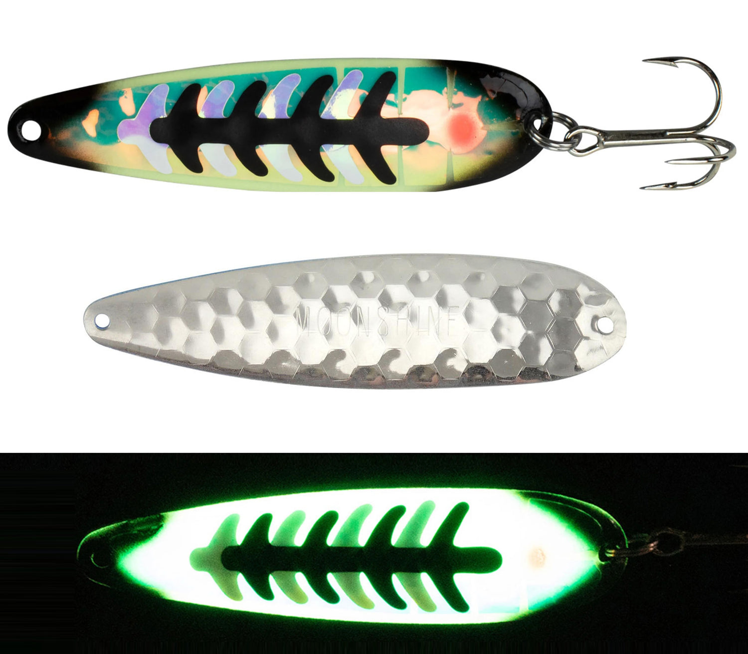 The Moonshine Lures RV Series Trolling Spoon delivers a realistic wiggle action that will encourage trout, salmon, steelhead, and many other species to attack. This spoon is painted with a patented glow paint to create a presentation of glow colors that is irresistible to fish. The Moonshine RV Series Spoon is produced from a family-owned and operated business that offers a high-quality product.