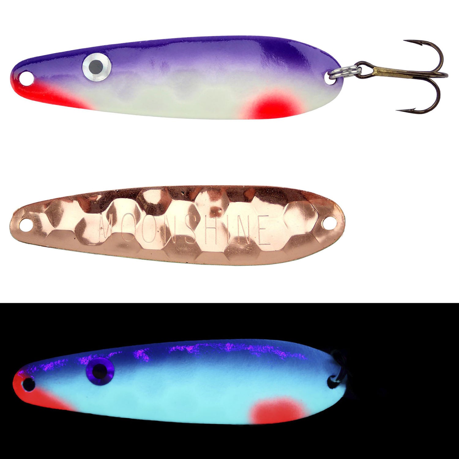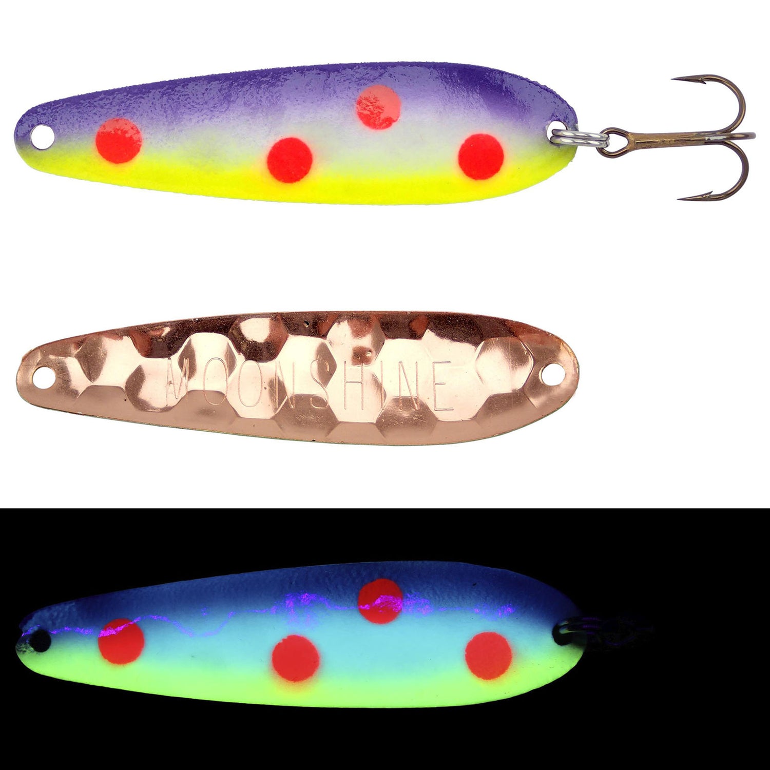 The Moonshine Walleye Spoon is a high-quality trolling spoon and is one the brightest UV glowing products offered by Moonshine. This durable 3-inch spoon features proven patterns for success that are painted with eye-popping colors. The amazing UV colors are best used in low light scenarios but the Walleye Spoons will even excel in daylight use!