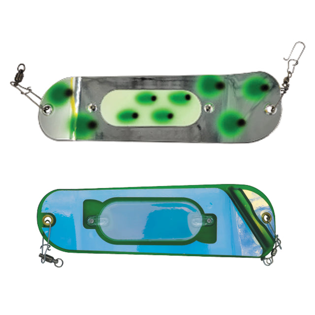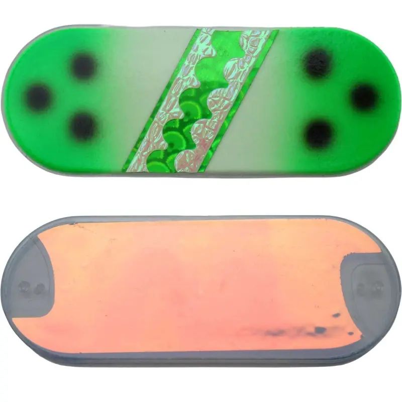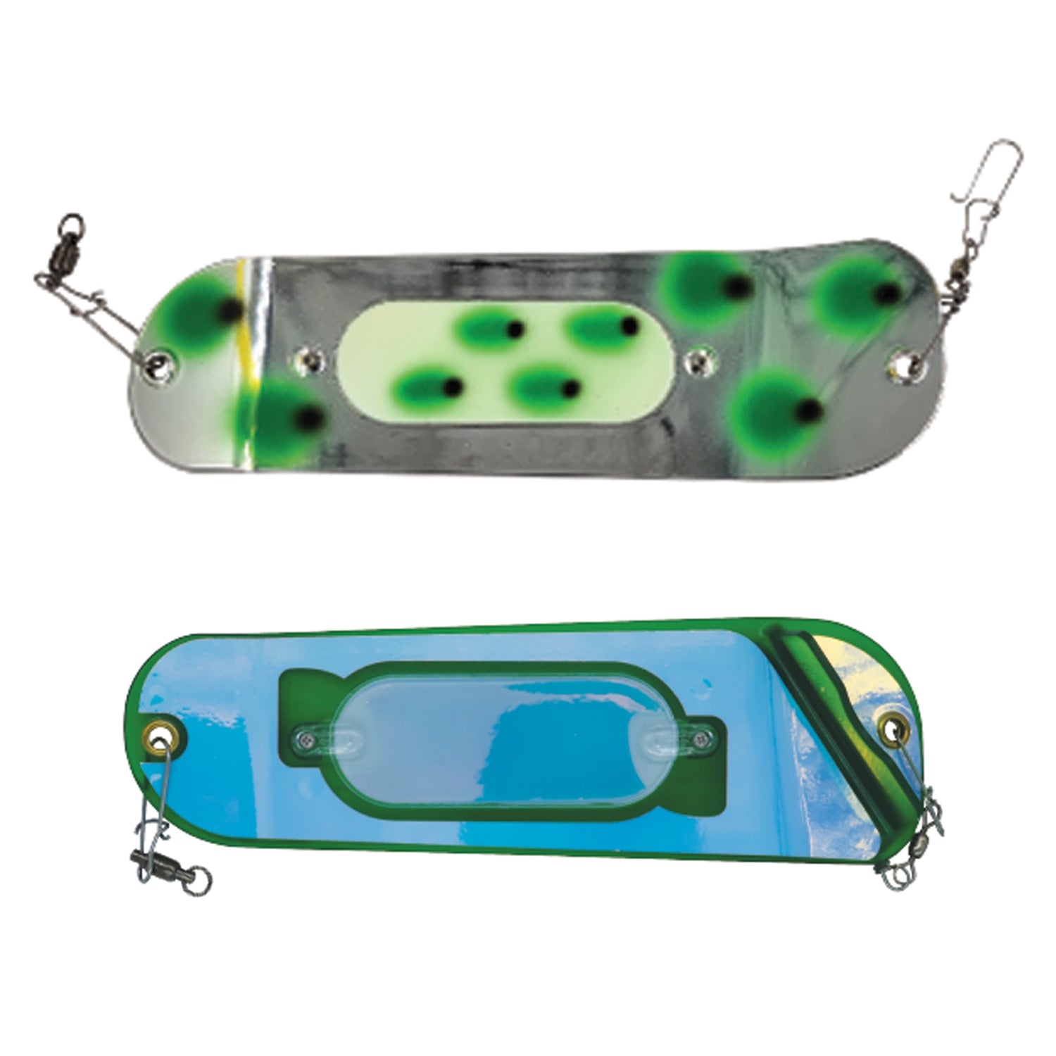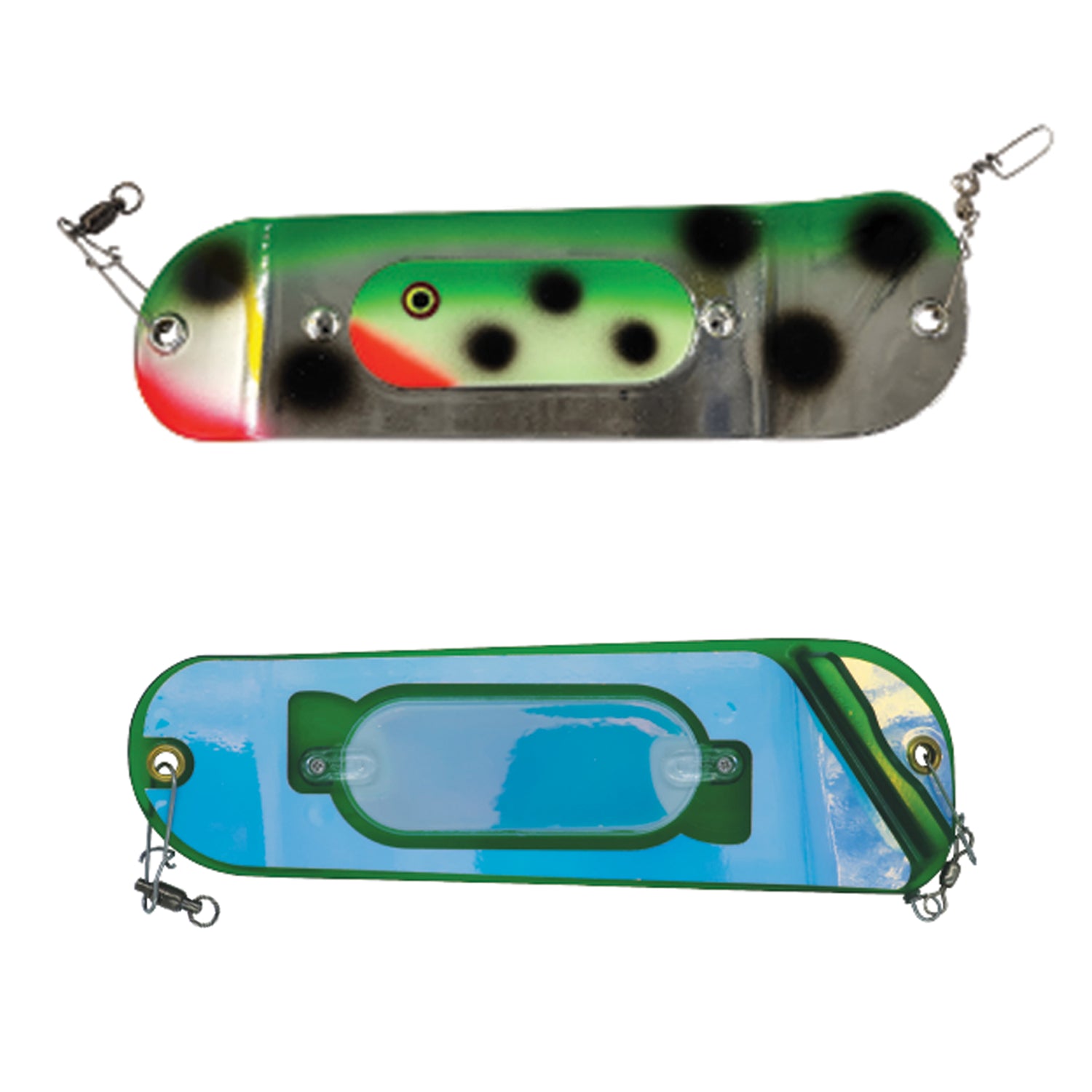 With the exception of the Black color choices, all Moonshine Flasher Lures mainframes have black dots and a special top coat for added flash. When you get additional Flasher inserts with their separate colors, you have a plethora of color options to send into the water! The Flasher is not just about colors – countless hours of on-water research time has produced an attractor with the proper spin at slow and fast speeds. Those who have used it are catching big salmon and trout! Adapt your flasher to what the fish are taking that day with the customizable Moonshine Lures Flasher!