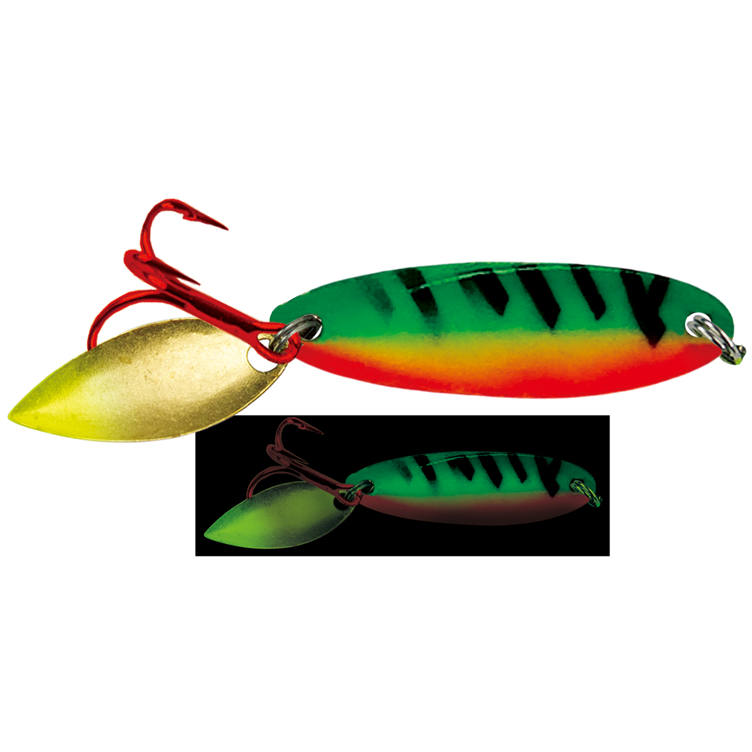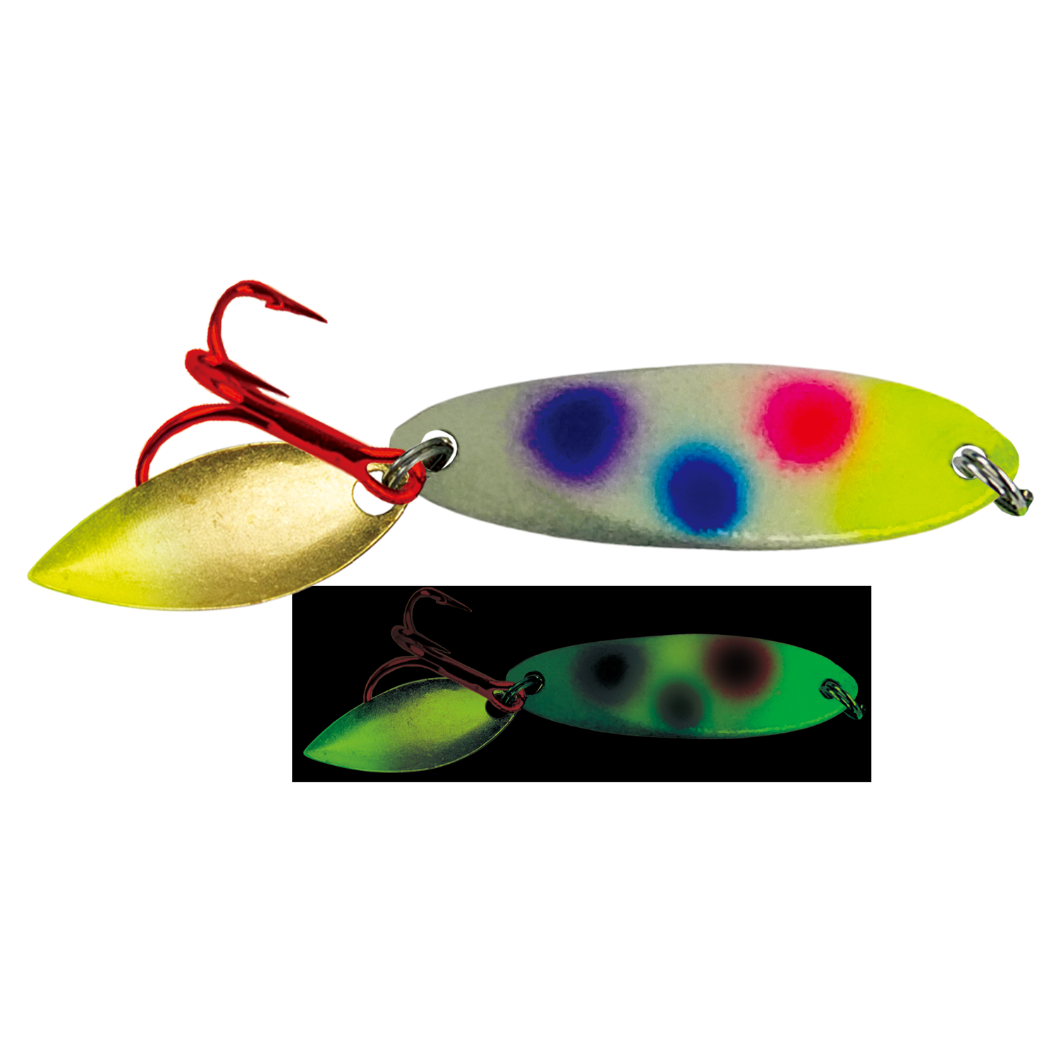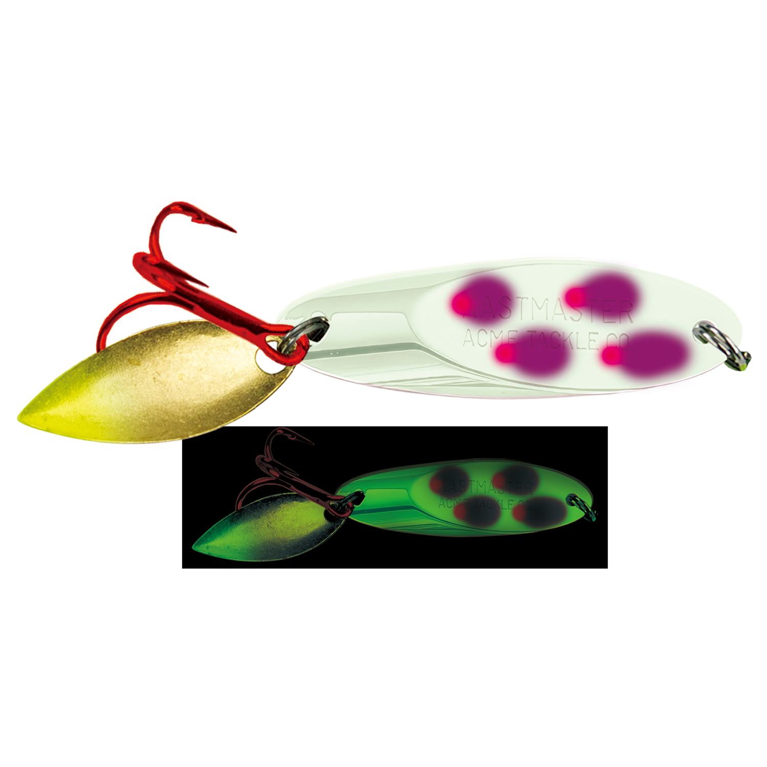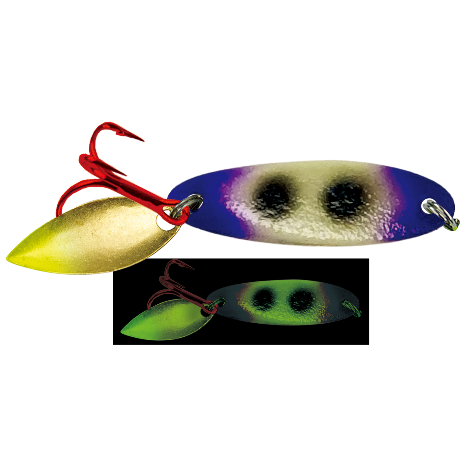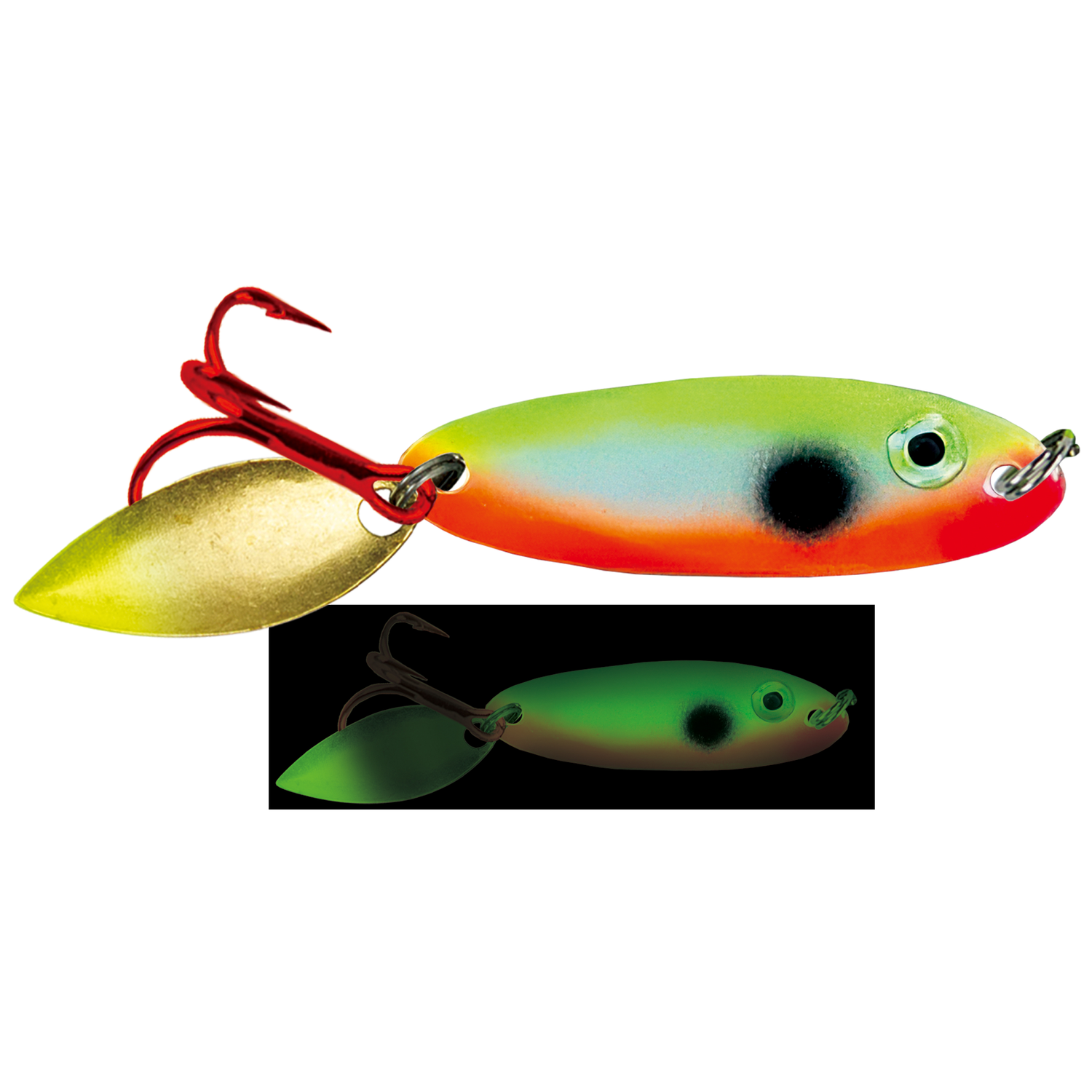 The legendary Acme Kastmaster® is outfitted for ice season with a red treble hook and gold/glow willow blade for extra flash and vibration. This glowing tip on the blade adds additional attention pulling power for dark environments. Finished in the innovative glow finishes from Moonshine Lures allows this bait to deliver a unique, fish-attracting luminescence to dark waters. When vertically fished this spoon provides wild action. Offered in 1/24oz, 1/12oz & 1/8oz sizes and 10 glowing colors.